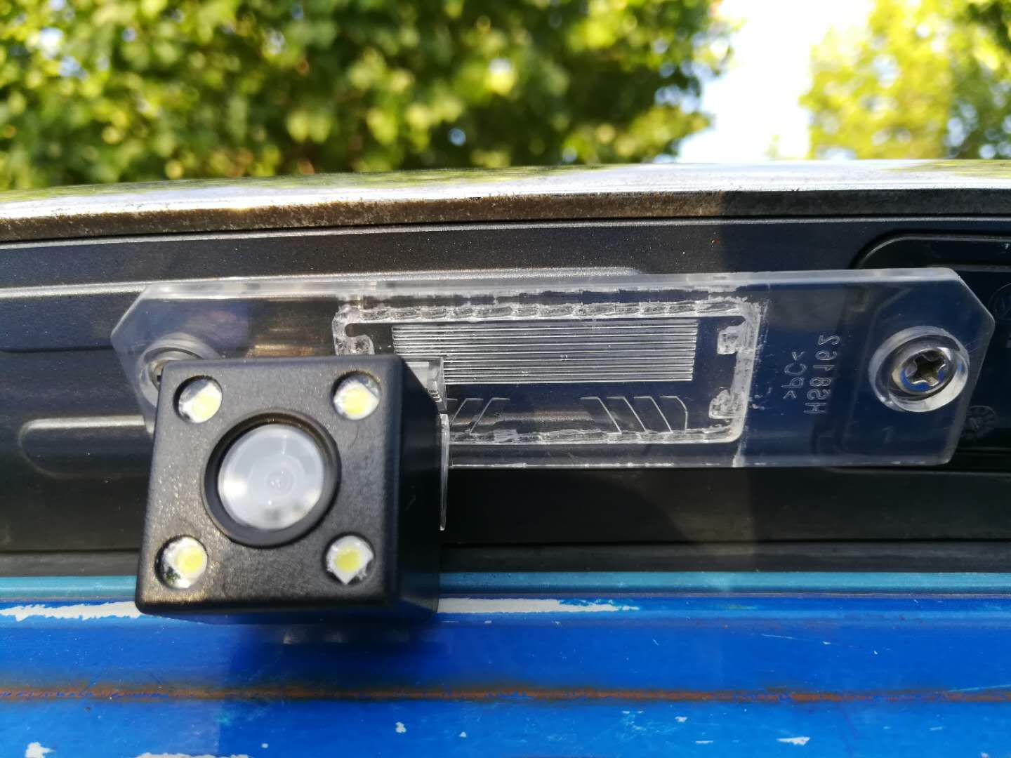 4、取下牌照灯的一个螺丝,换成稍长螺丝,用来固定倒车摄像头的右边,左边打孔加垫固定,对摄像头支架稍加改造,正好摄像头装在中间位置,视野最好,还不废掉牌照灯