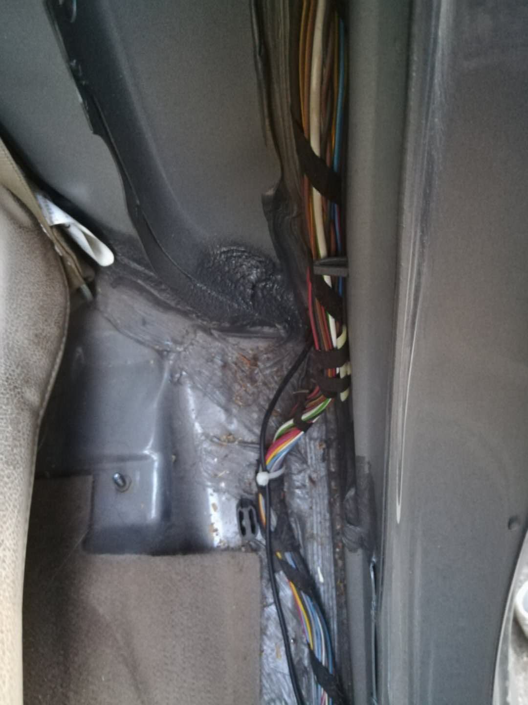 7、拆开主驾驶到后备箱的线路覆盖部分进行穿线,技巧很多,不能狠拆,有些地方得用钢丝带动穿线